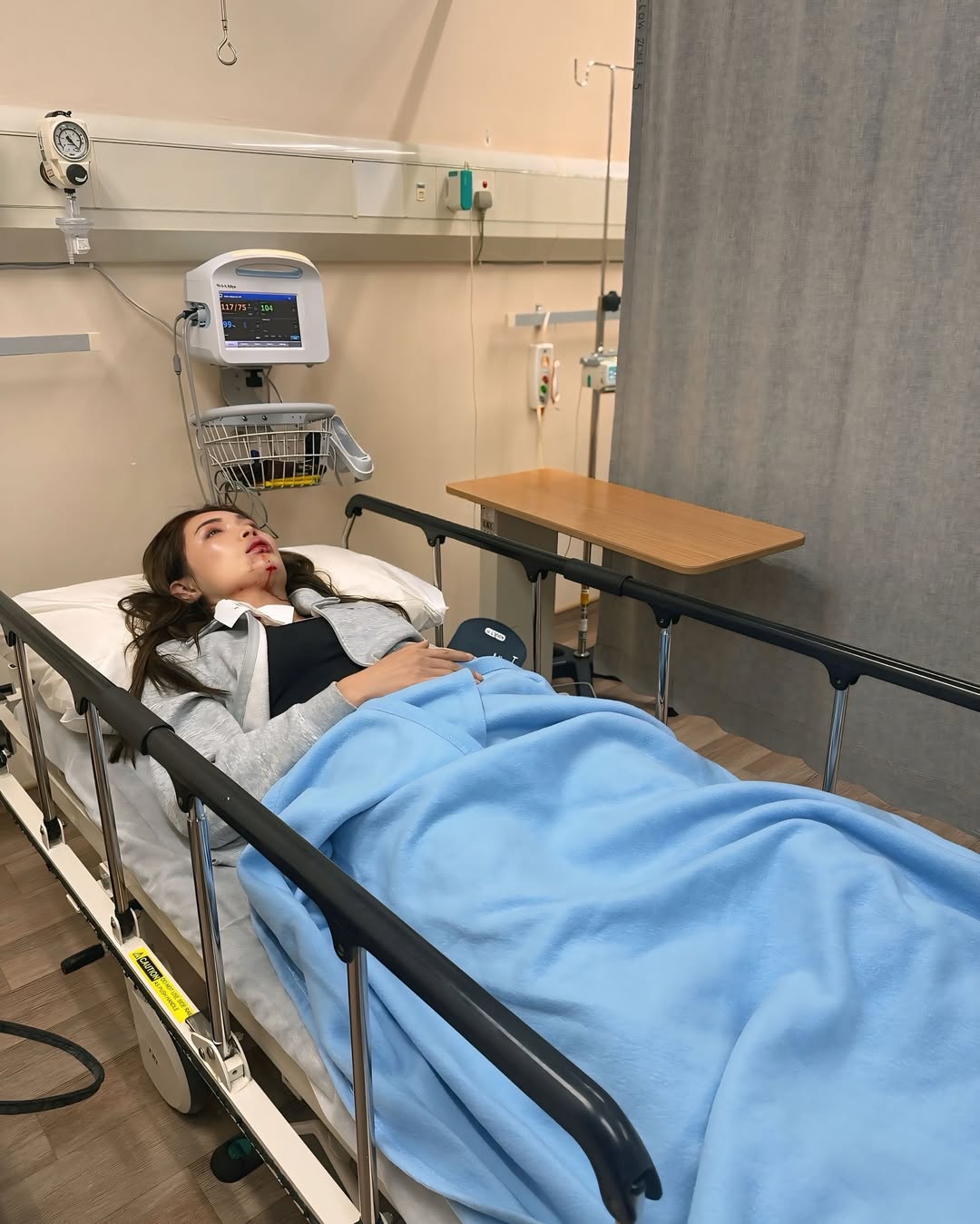 Chia later took to Instagram to apologise for causing concern, sharing graphic photos of her injury — including blood near her mouth and a large pool of it on the floor.