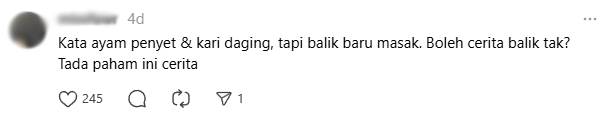 Translation: You said ayam penyet and curry meat, but you said you went back and cook. Can you explain again? I don’t understand the story.