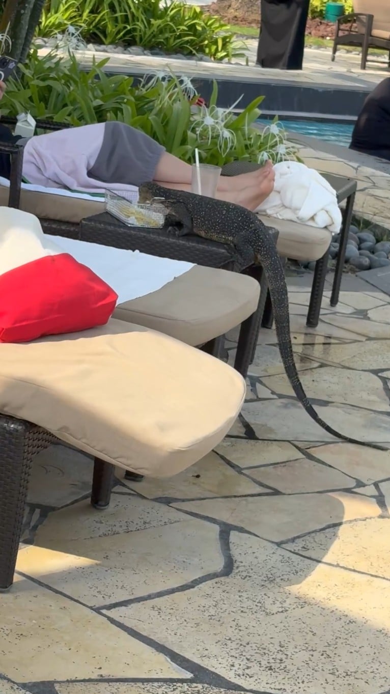 Her restful afternoon took a shocking turn when she spotted the monitor lizard crawling under the chair next to her.