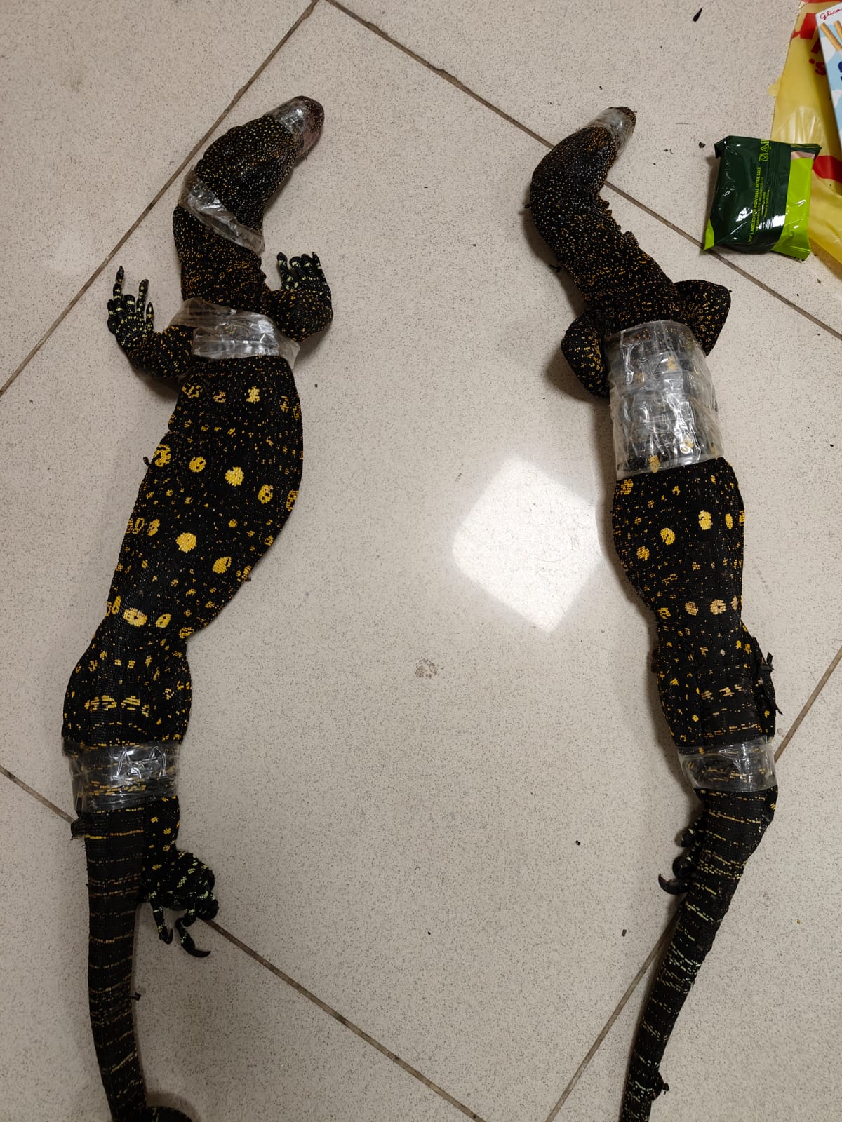 Photos released on X by customs at Tiruchirappalli International Airport showed that the reptiles had been wrapped in black cloth, with their mouths and legs bound with tape to prevent them from moving.