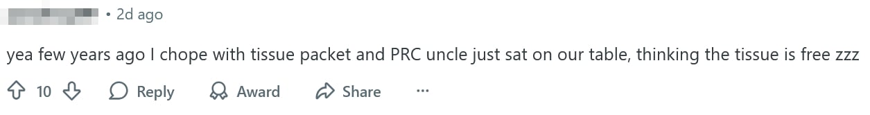 To this, one commenter brought up an anecdote where they choped a table with a tissue packet, only for an uncle from China to mistakenly assume it was free tissue paper.