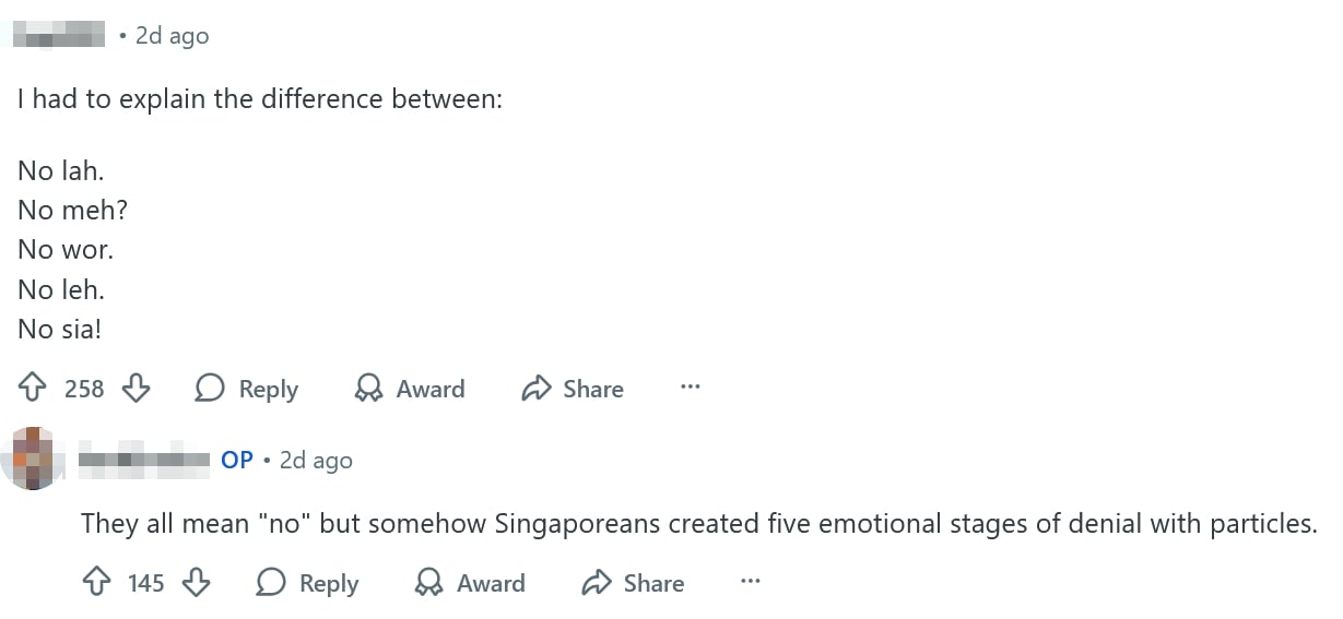 Others pointed to Singlish, noting the difficulty in explaining the differences between inflections such as: