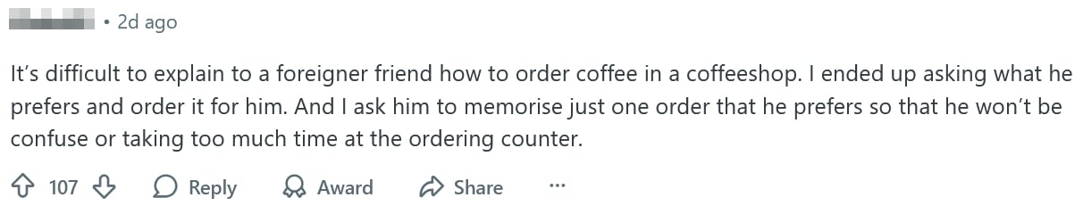 Coffee orders at hawker centres and coffeeshops also posed a challenge, with one local commenter having to order it for their foreign friend.