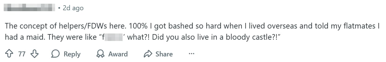 While living overseas, the netizen mentioned that they had a “maid”, shocking foreign flatmates due to the perceived costliness of such hires.