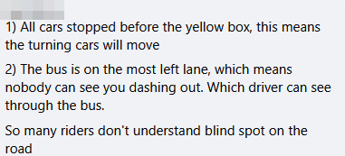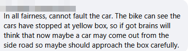Most netizens blamed the motorcyclist for the accident. One of them pointed out that the rider should have seen the other vehicles stopping at the yellow box.