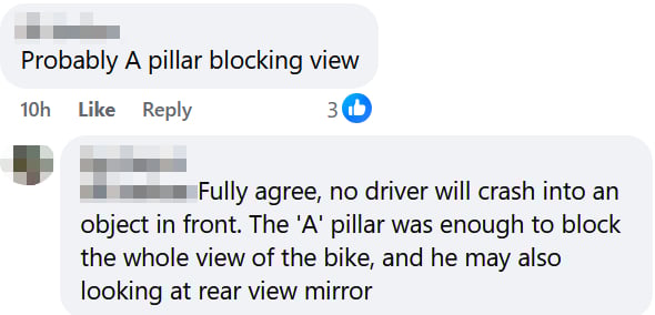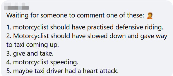 Another user called out the tendency of the SGRV comments section to blame the motorcyclist in accidents by listing several excuses, none of which applied here.