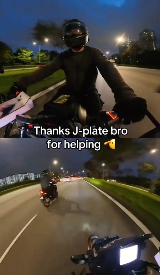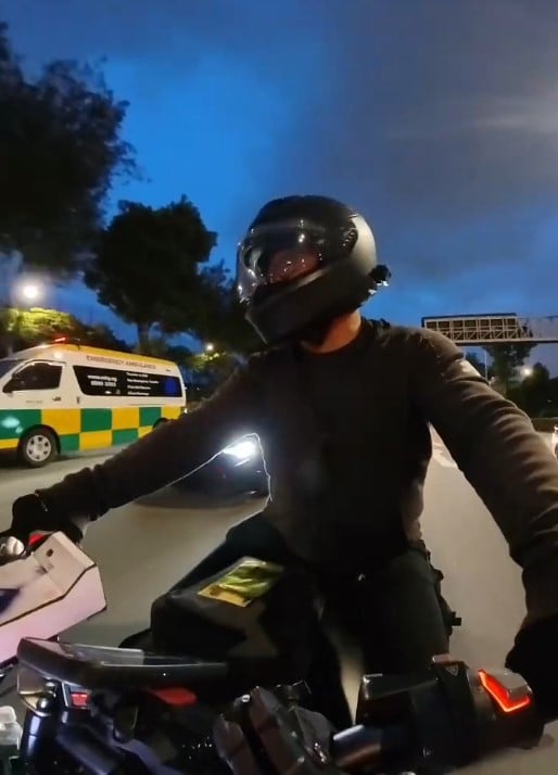 Another motorcycle with a J-plate, which could mean it is foreign-registered, appeared to help him by travelling between lanes so that vehicles would not obstruct the ambulance.