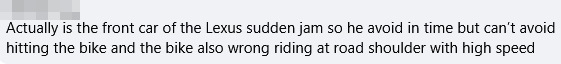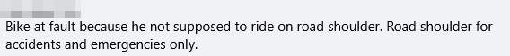 A commenter opined that the motorcyclist was at fault as he was not supposed to ride on the road shoulder.