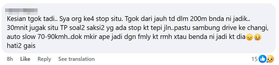 Translation: Felt so sorry seeing it earlier. I was the fourth person to stop there. From about 200 metres away, I saw it happen. I stayed there for around 30 minutes while the Traffic Police questioned the witnesses who had stopped by the roadside. After that, I continued driving to Changi, automatically slowing down to 70 to 90 km/h. I kept thinking about what must be happening to the family at home, not knowing that this had happened to them. Be careful, guys.