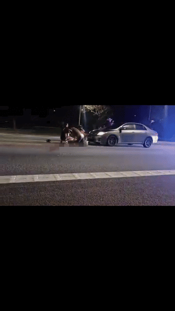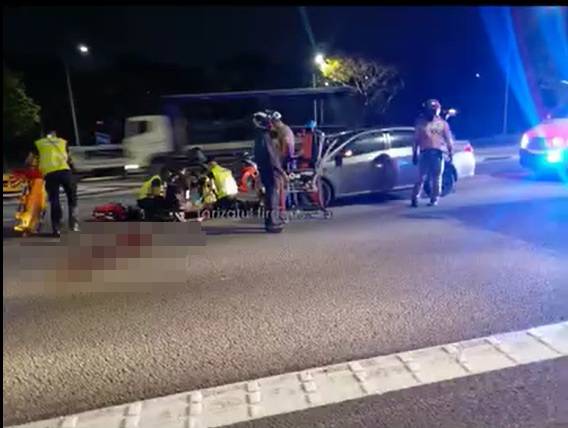 A video shared on Facebook by Farizatul Firdaus shows several members of the public gathered around a man lying motionless on the road, beside a grey car and a fallen motorcycle.