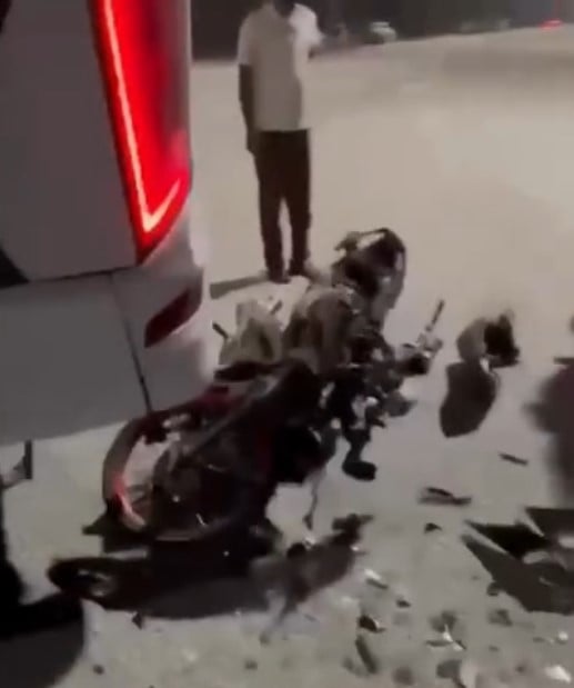 Other images showed the motorcycle lying wrecked beneath the bus.