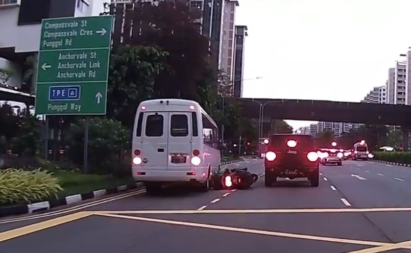 A motorcyclist was almost run over by a minibus when he fell onto the road after colliding with a car in Sengkang last Friday (6 March).