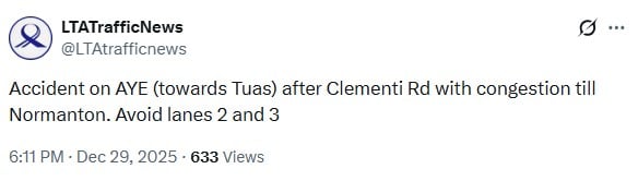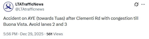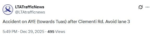 In a post on X at 5.49pm on Monday (29 Dec), the Land Transport Authority (LTA) said the accident had occurred along the AYE in the direction of Tuas, after the Clementi Road exit.