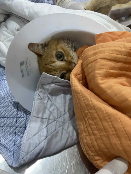 Apart from a bandaged leg and a cone around its neck, the cat appeared to be alert and in good health.