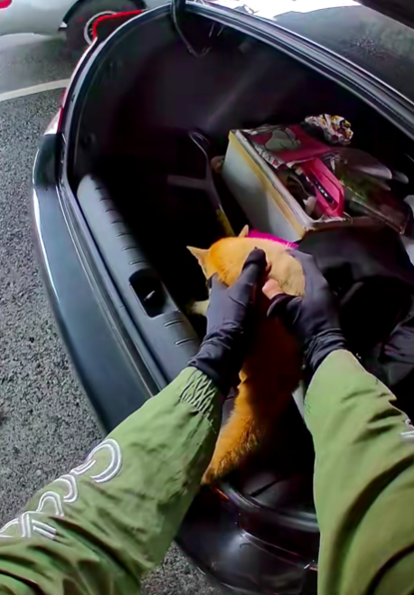 Gingerly picking up the animal, the motorcyclist transferred the cat into the boot of his car.