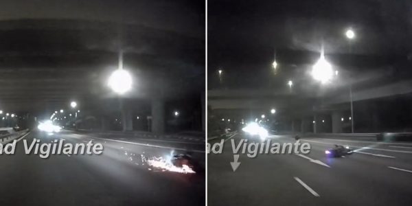 Motorcyclist crashes & slides across TPE in spark-filled accident