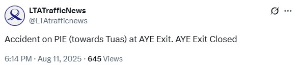 At 6.14pm on Monday (11 Aug), the Land Transport Authority (LTA) posted on X that an accident had occurred along the PIE in the direction of Tuas.