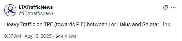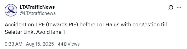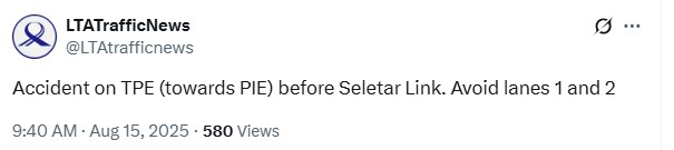 In a post on X, the Land Transport Authority (LTA) said at 9.40am on Friday (15 Aug) that an accident had occurred on the TPE towards the Pan-Island Expressway, before the Seletar Link exit.
