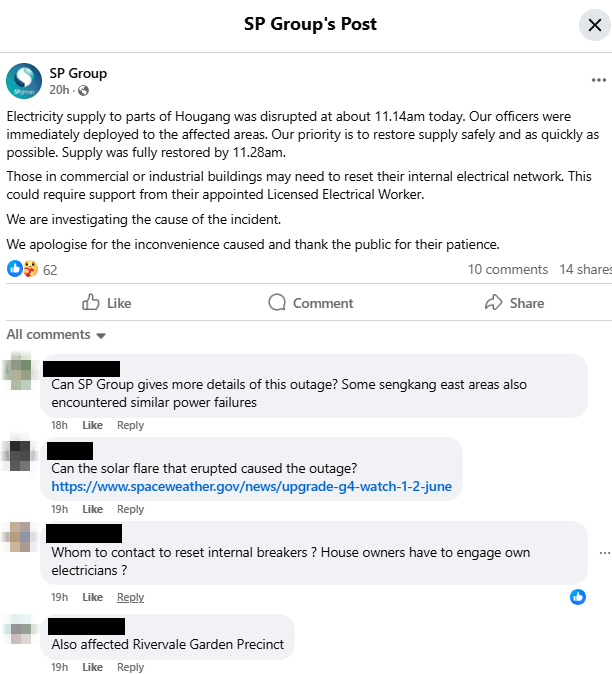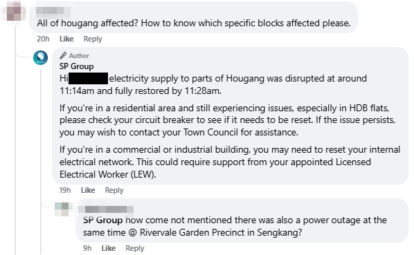 When asked which blocks were affected, SP Group replied in the comments that the disruption was limited to “parts of Hougang” but did not disclose specific addresses.