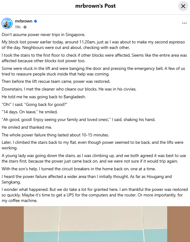 “Don’t assume power never trips in Singapore,” he wrote. “My block lost power earlier today, around 11.20am, just as I was about to make my second espresso of the day.”