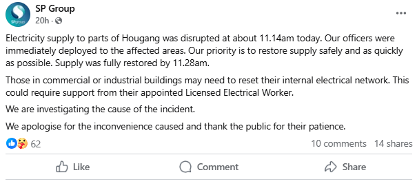 SP Group confirmed in a Facebook post on Monday (3 June) afternoon that power supply to “parts of Hougang” was disrupted at about 11.14am. Power was fully restored by 11.28am.
