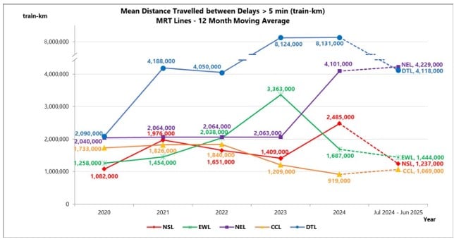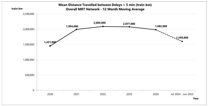 According to the report, MRT trains ran 1.598 million train-km without disruptions of more than five minutes between July 2024 and June 2025.