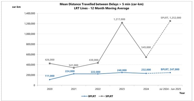 The Bukit Panjang LRT (BPLRT) remained steady and improved slightly to 247,000 car-km between delays, from 232,000 car-km in 2024.