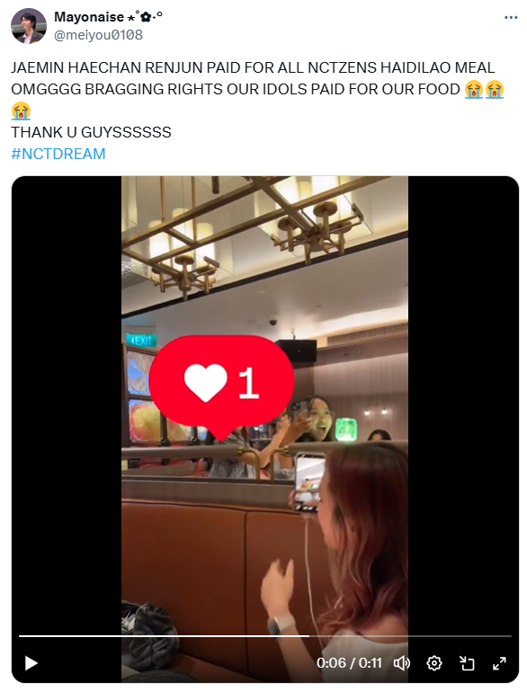 Fans of NCT Dream received the surprise of a lifetime after part of the K-pop group decided to pay for all their meals at Haidilao.