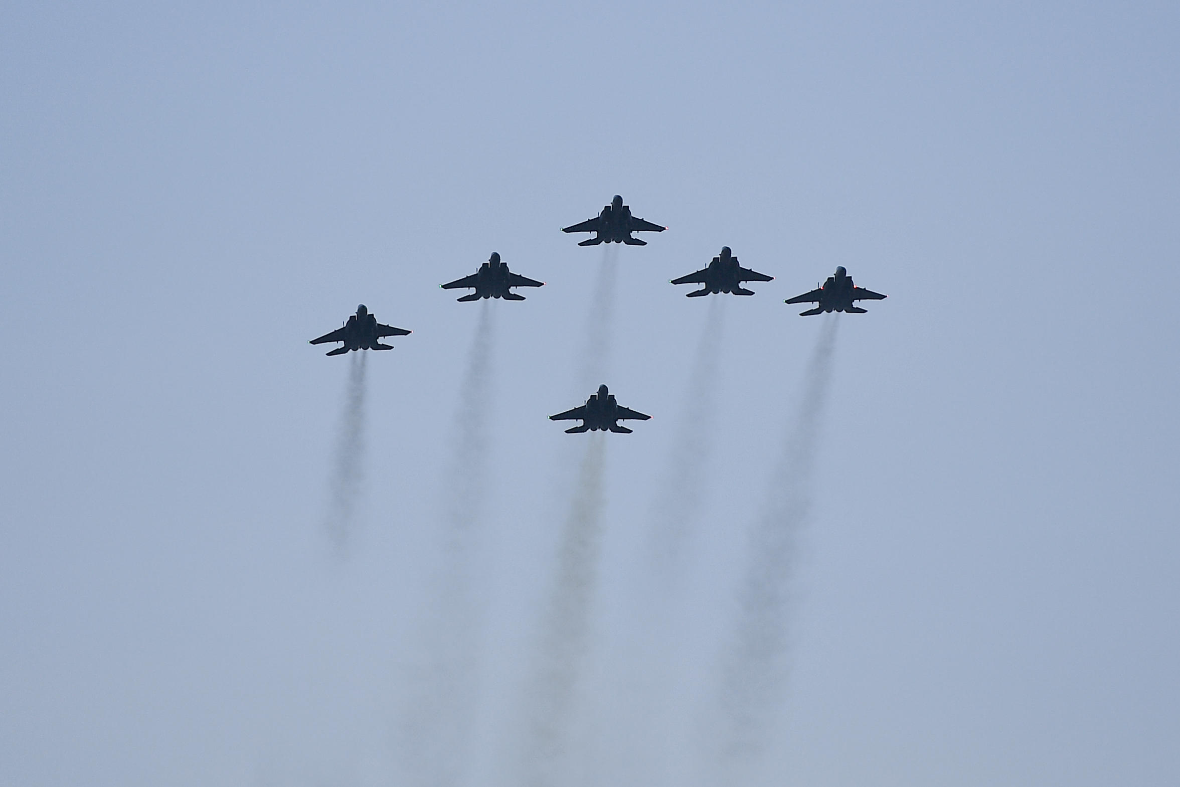 The manoeuvre consists of multiple F-15s coming in from different directions at high speed and low altitude, before they pull up into a climb.