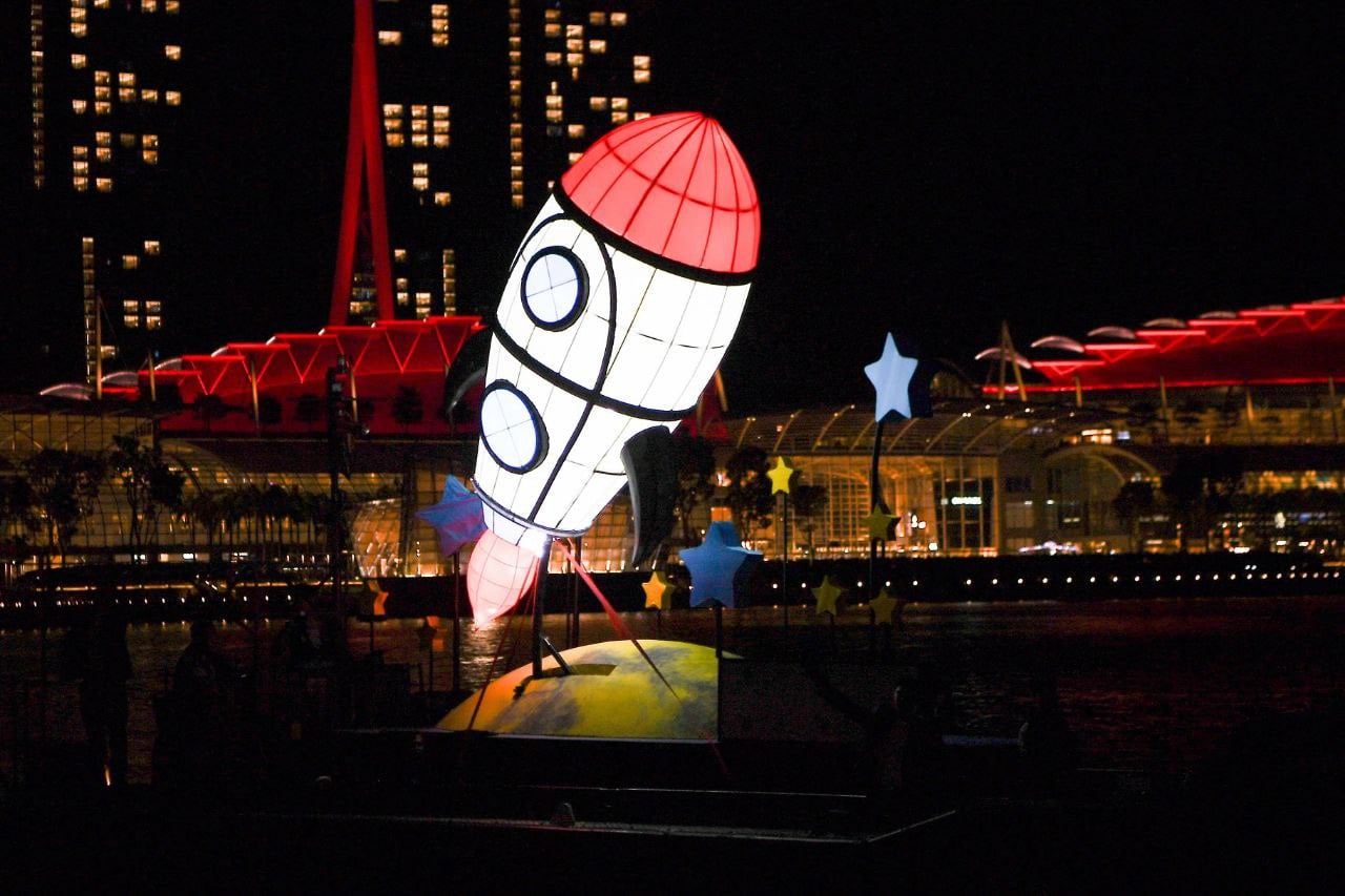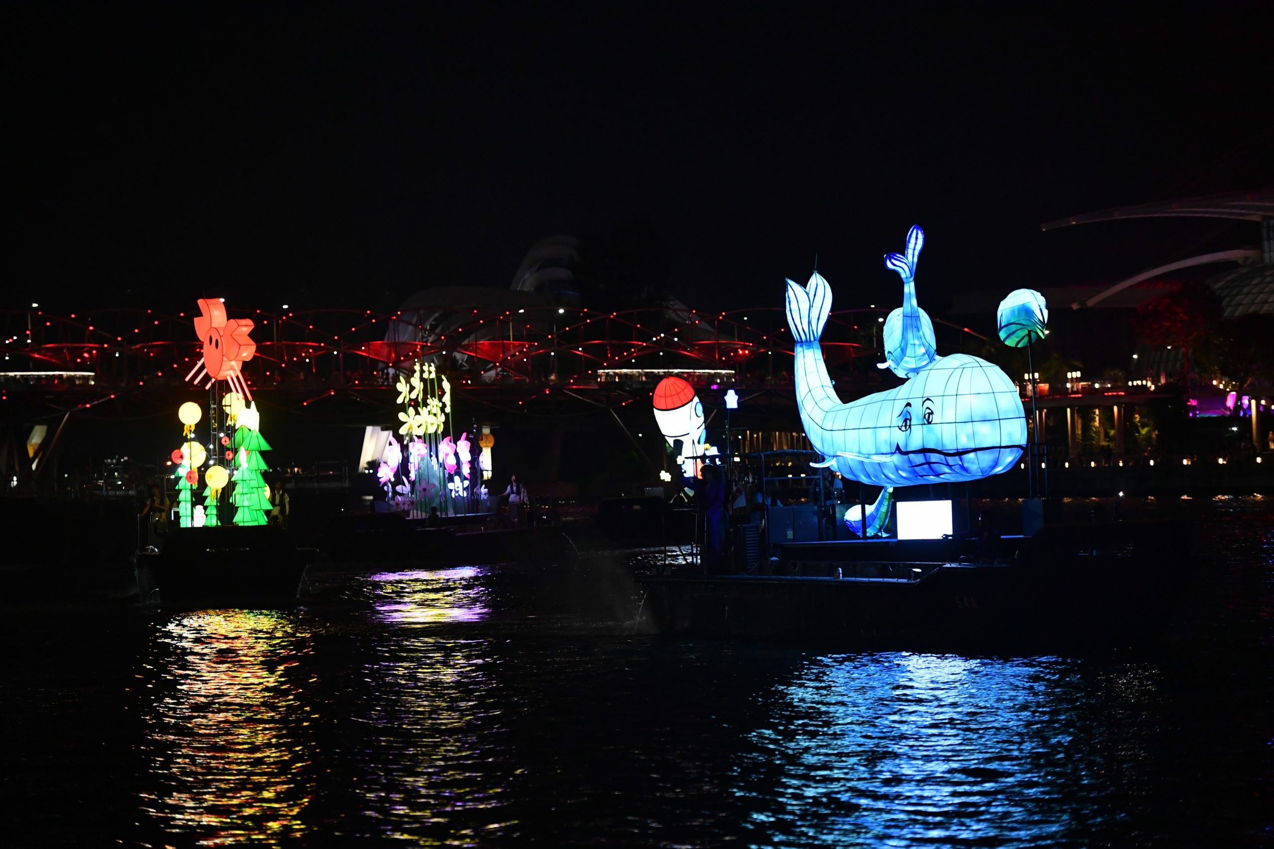 As the floats glide across land and water, their artworks are projected onto buildings like Fullerton Hotel and UOB Plaza, turning the city skyline into a living canvas.