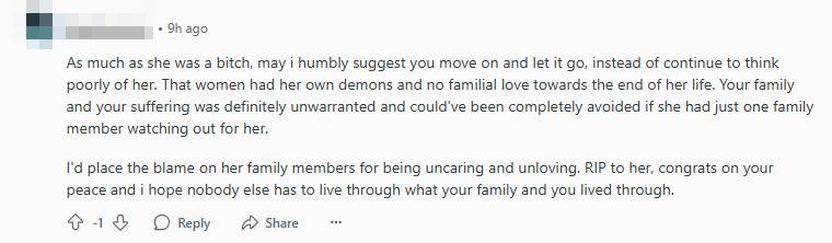 However, another user urged the OP to move on and said the elderly woman’s situation could’ve been better if there were loved ones caring for her.
