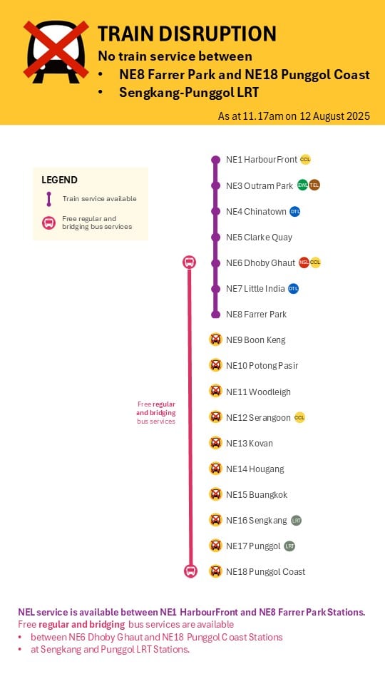 An MRT train disruption had occurred on the North East Line (NEL) at about 11.17am today (12 Aug).