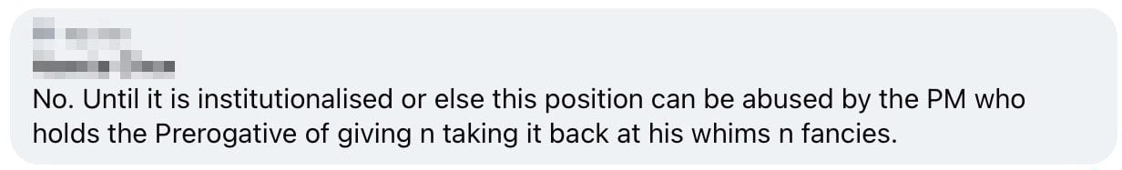 One netizen went so far as to say that the position should be vacant until it is “institutionalised”.