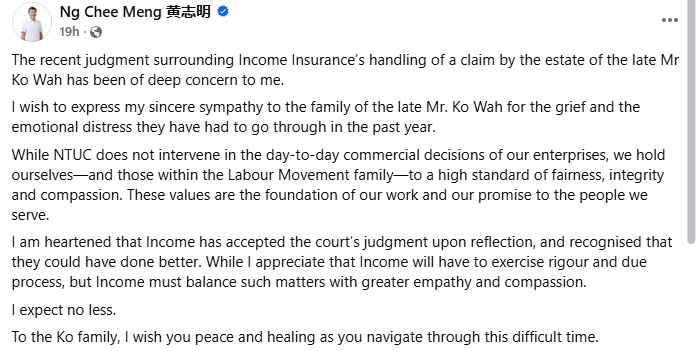 Ng said he was heartened that Income Insurance — previously known as NTUC Income — had accepted the judgment and acknowledged that it could have “done better.”