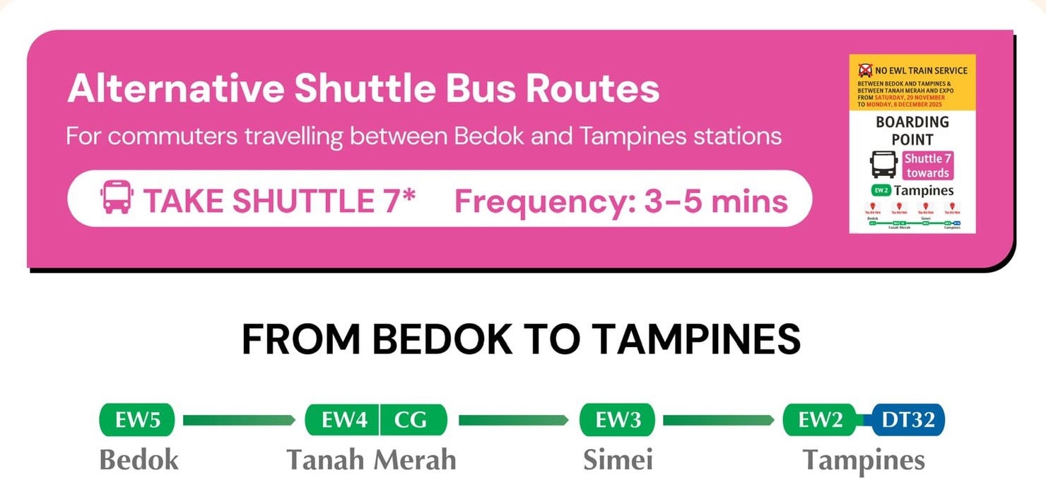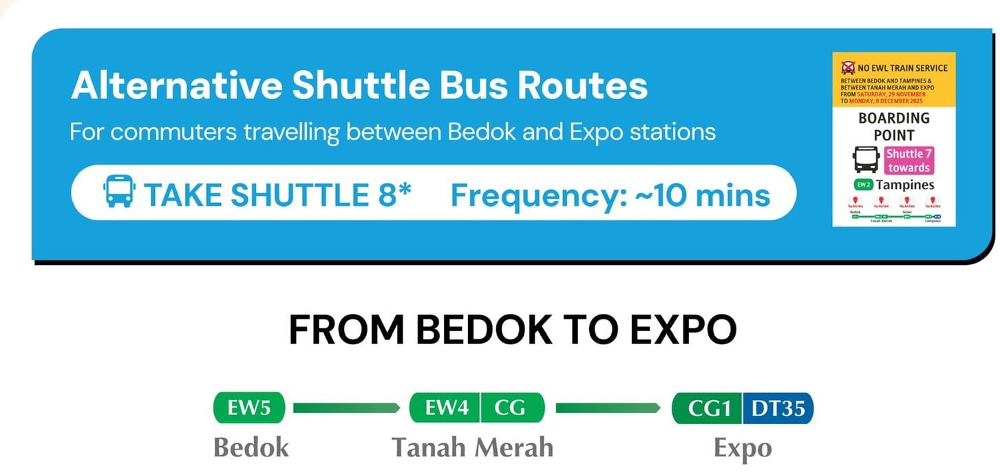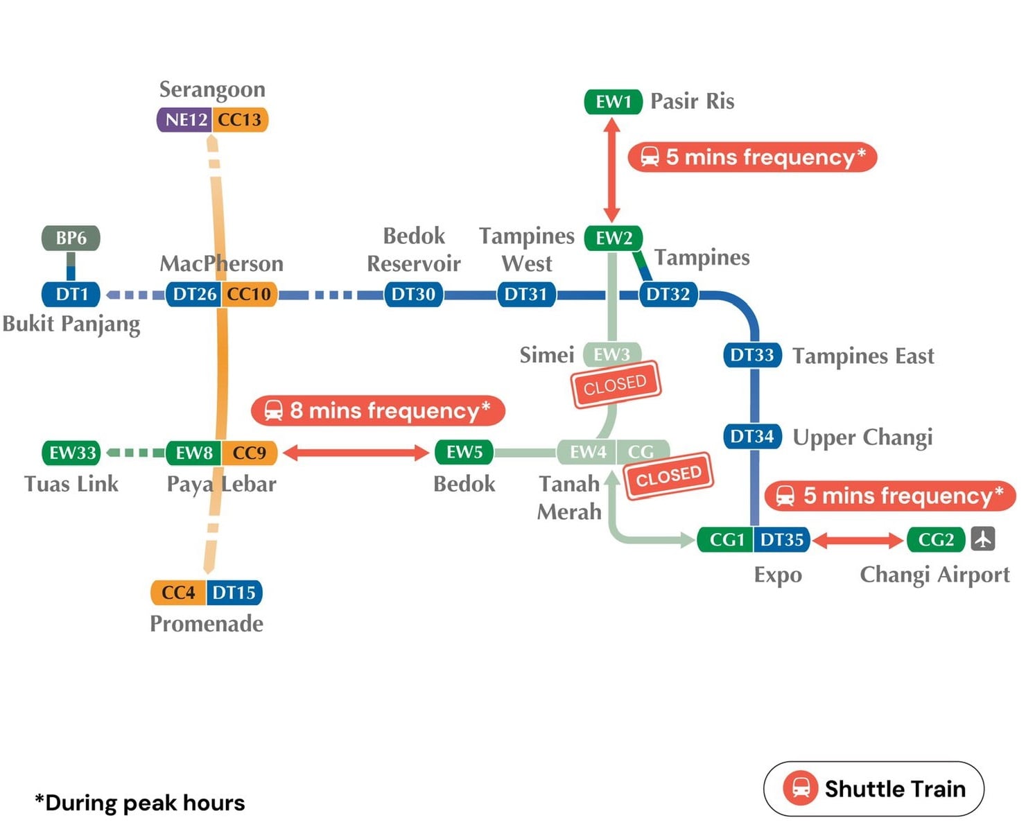 During this period, there will be no train service between Bedok and Tampines stations, and between Tanah Merah and Expo stations.