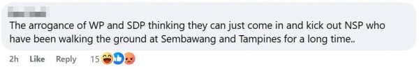 Others defended NSP’s decision, claiming the party has long walked the ground in both Sembawang and Tampines and shouldn’t be expected to withdraw simply because larger opposition parties entered the fray. They also felt that the WP and SDP were “being arrogant” by “thinking they can just come in and kick out” NSP.
