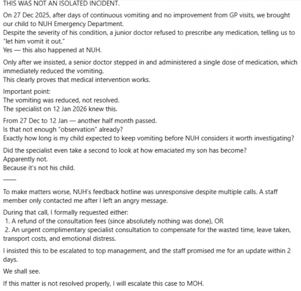 A parent in Singapore has taken to Facebook to air her anger over what she claims was medical negligence at the National University Hospital (NUH), after her son was allegedly dismissed despite suffering months of unexplained vomiting.