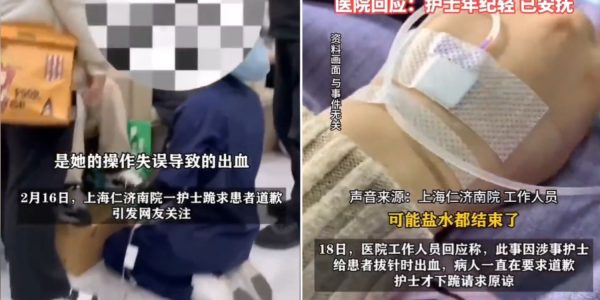 Nurse in Shanghai kneels & begs for forgiveness after patient demands apology for minor bleed from IV removal