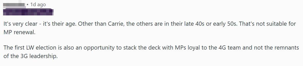 A netizen felt that age could be a factor, with most of the MPs stepping down in their late 40s and early 50s. In their opinion, this age group is not ideal for the renewal process under Prime Minister Lawrence Wong.