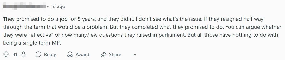 Another netizen asked why we are using “a different yard stick” to judge the out-going MPs, given five years is a pretty long time for a job nowadays.