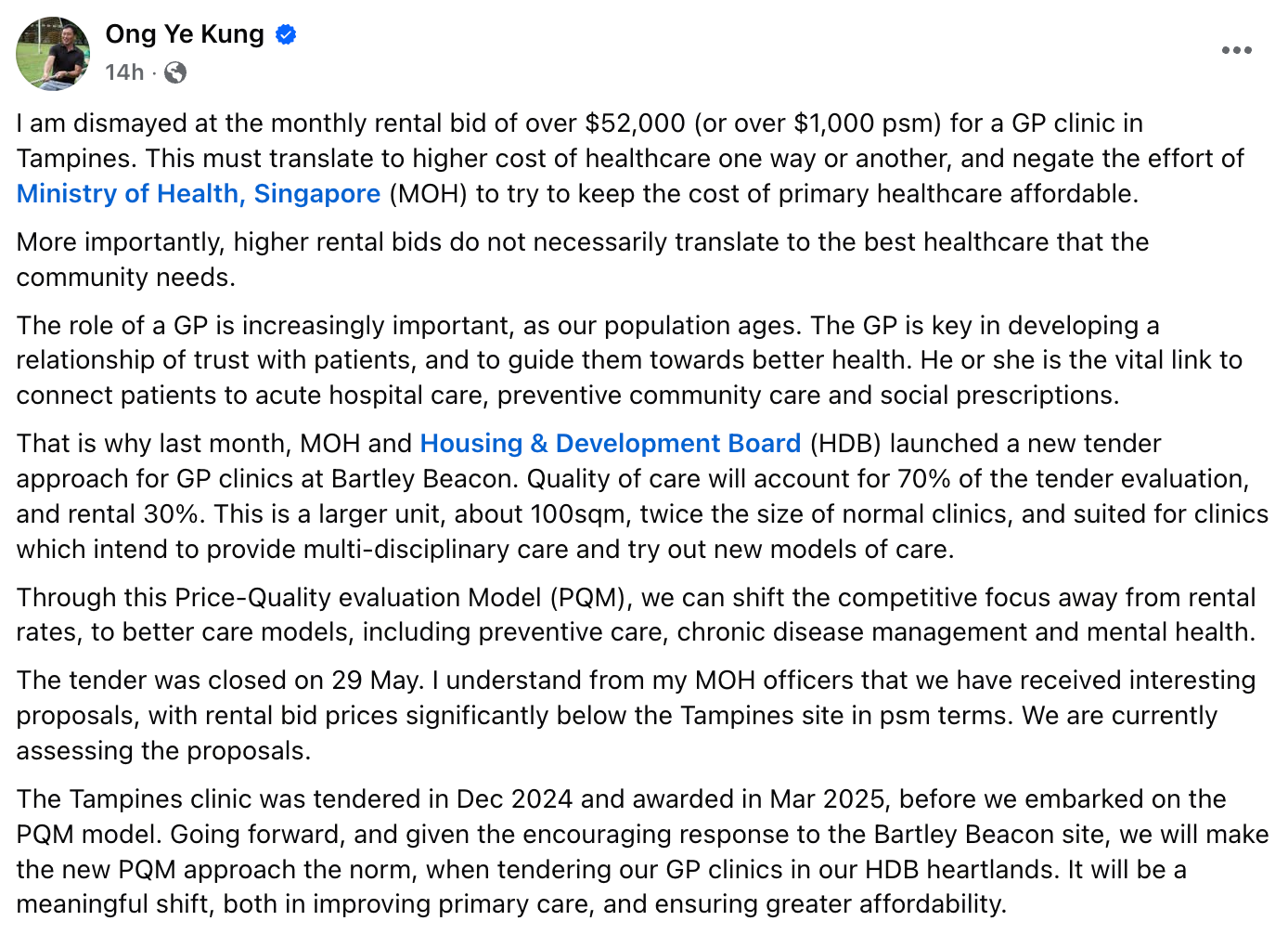 In a Facebook post on 4 June, Mr Ong said the rental rate — equating to over S$1,000 per square metre (sq m) — would “one way or another” result in more expensive healthcare services and undermine efforts by the Ministry of Health (MOH) to keep primary care affordable.