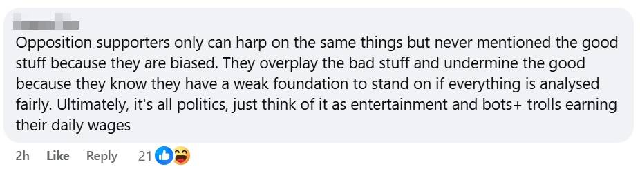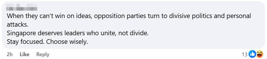 Another commenter agreed that opposition parties tend to resort to divisive politics and personal attacks, saying, “Singapore deserves leaders who unite, not divide.”