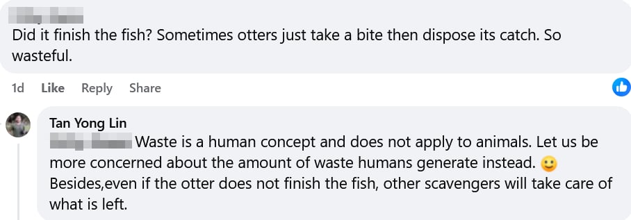 Mr Tan responded by pointing out that waste is a “human concept”, as scavengers would naturally take care of anything the otter had left uneaten.
