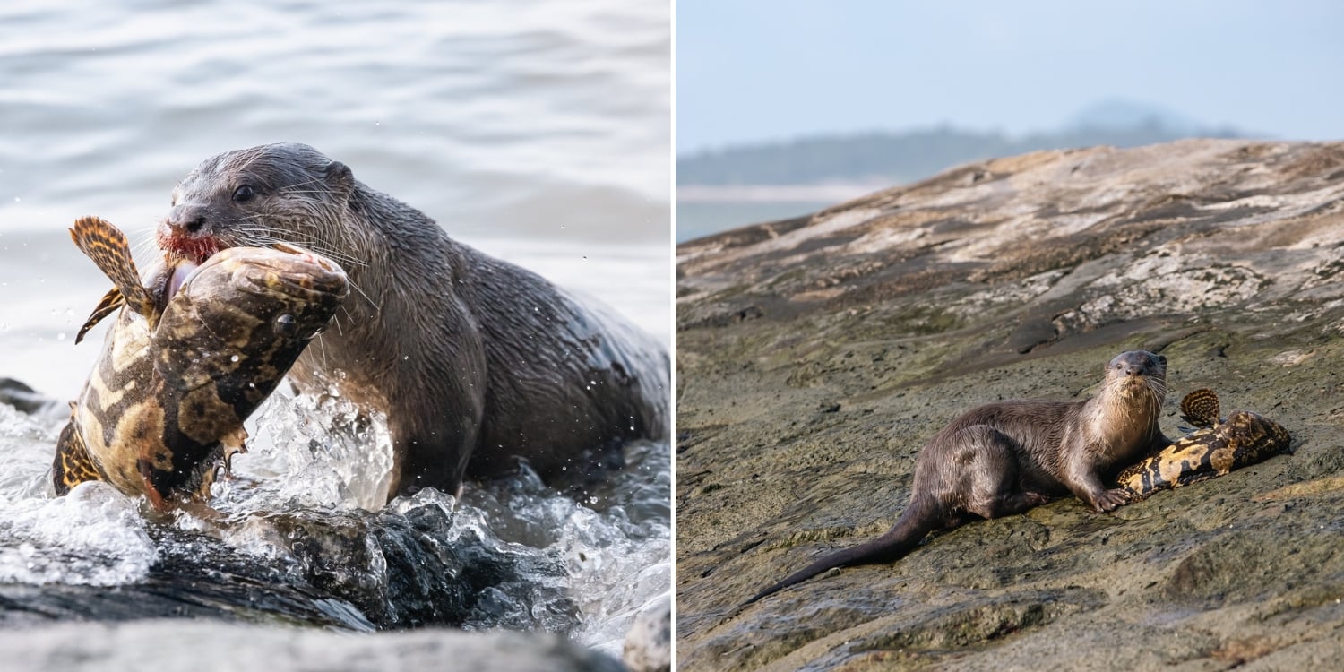 Singapore photographer snaps otter catching & eating invasive grouper at Changi Beach