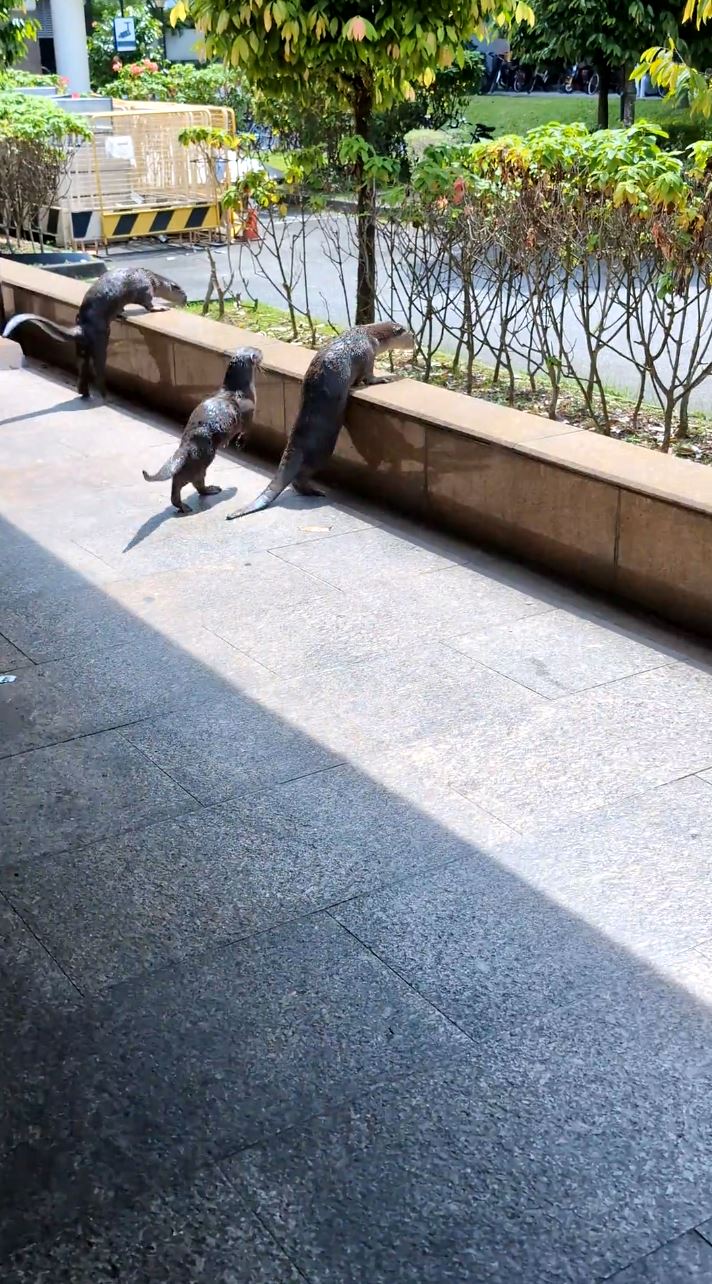 A few seconds later, the otters waddle into a nearby bush separating the park from the MRT station.