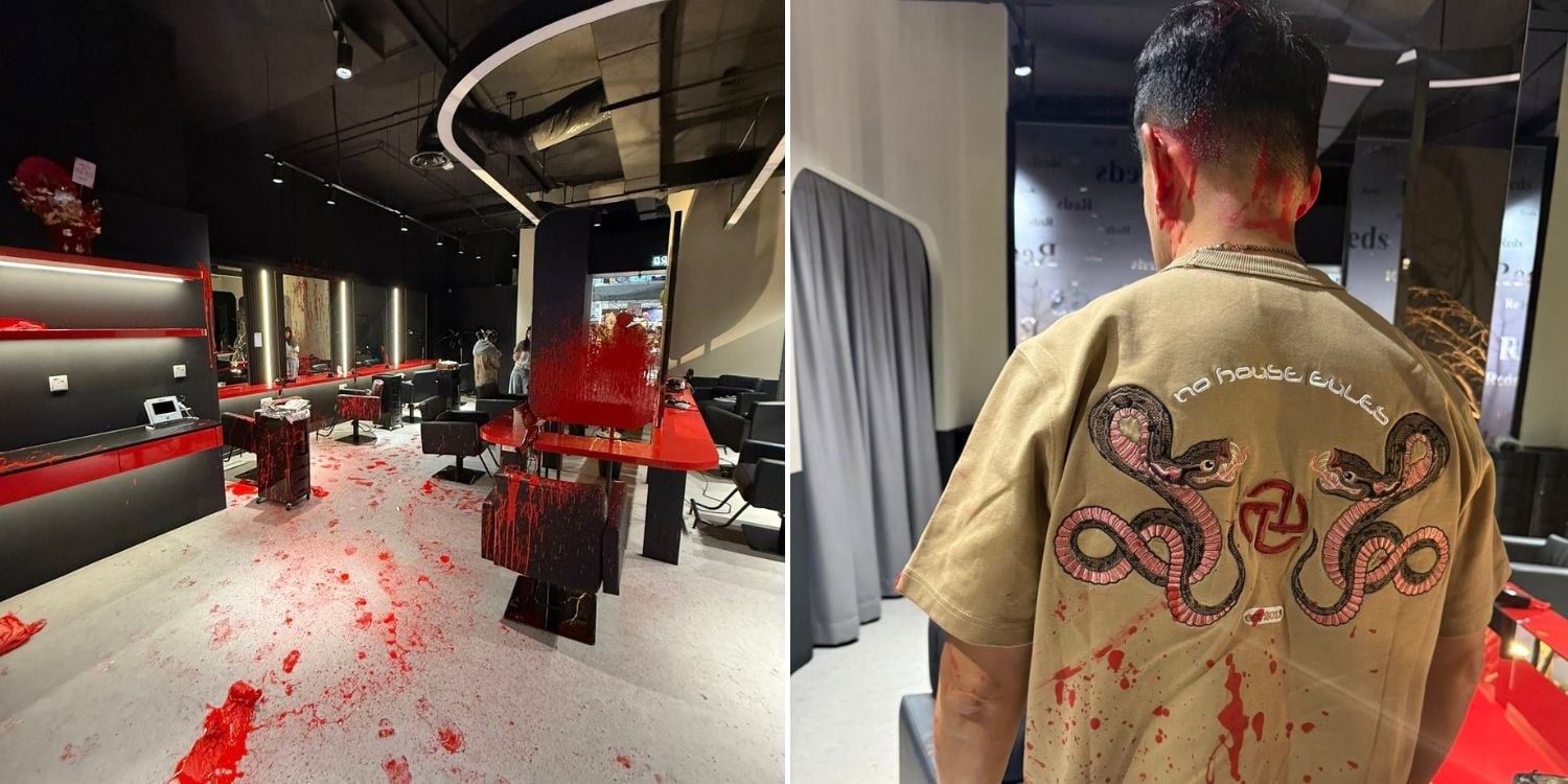 Photos uploaded by Mr Ang showed the salon’s black-and-red interior heavily vandalised, with red paint coating the floors, chairs, mirrors, and counters.