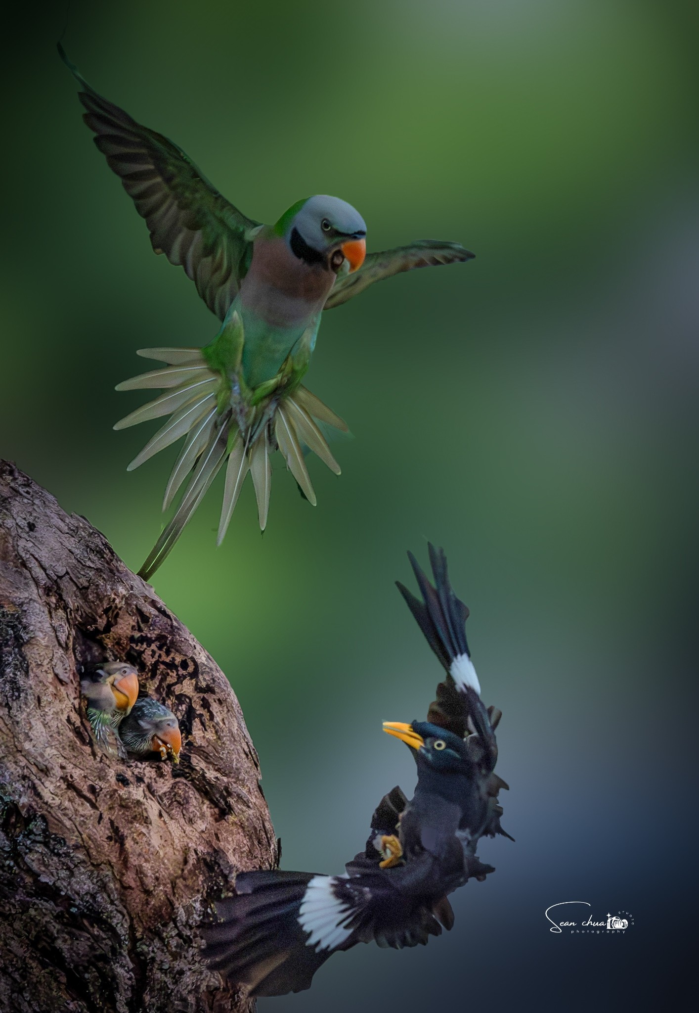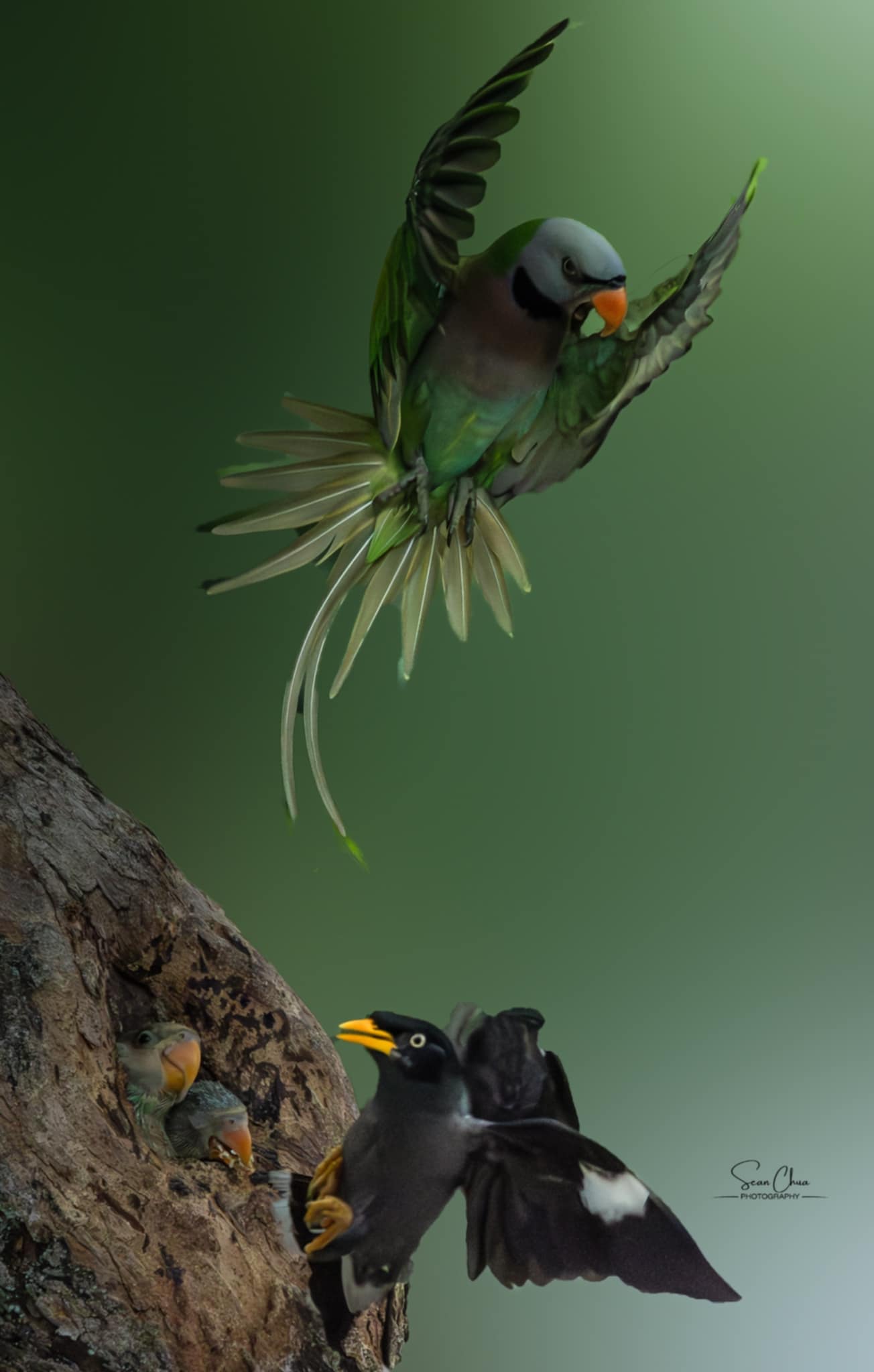 The dramatic photo, snapped by tuition teacher Sean Chua at Jalan Bukit Merah, shows the parakeet in mid-air, fending off the intruding myna just inches from its vulnerable chicks.