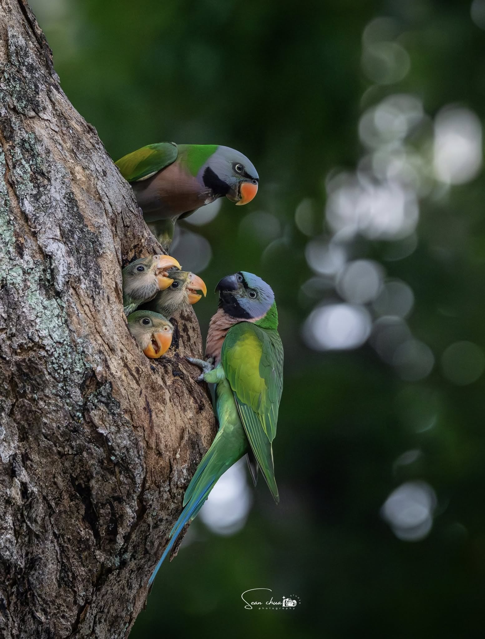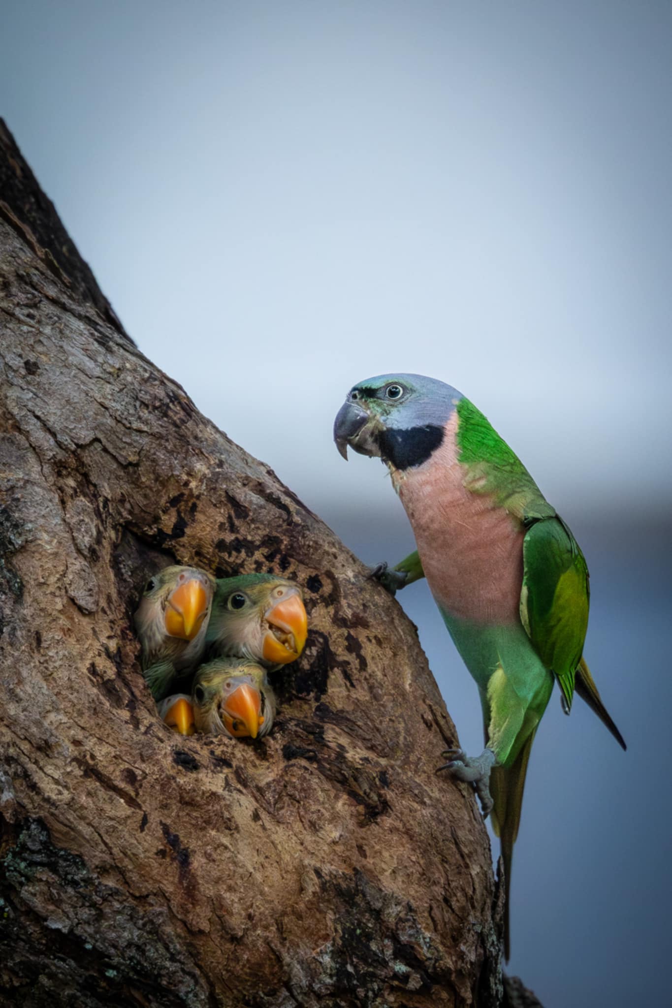 They nested in a small tree hole, with only enough space for three chicks to poke their heads out at a time.