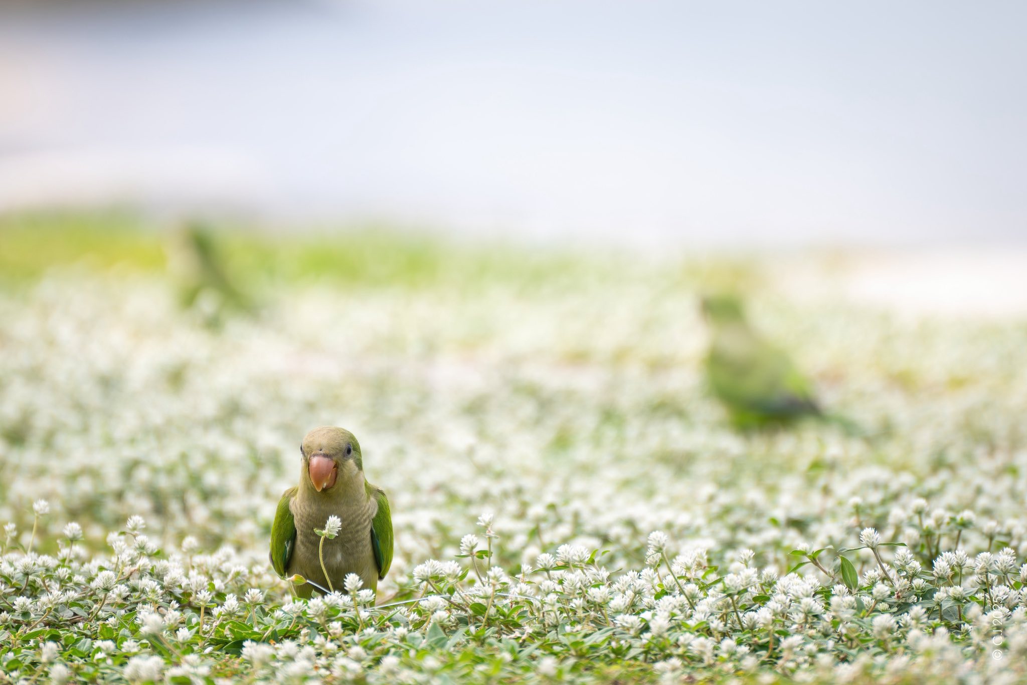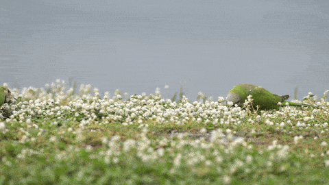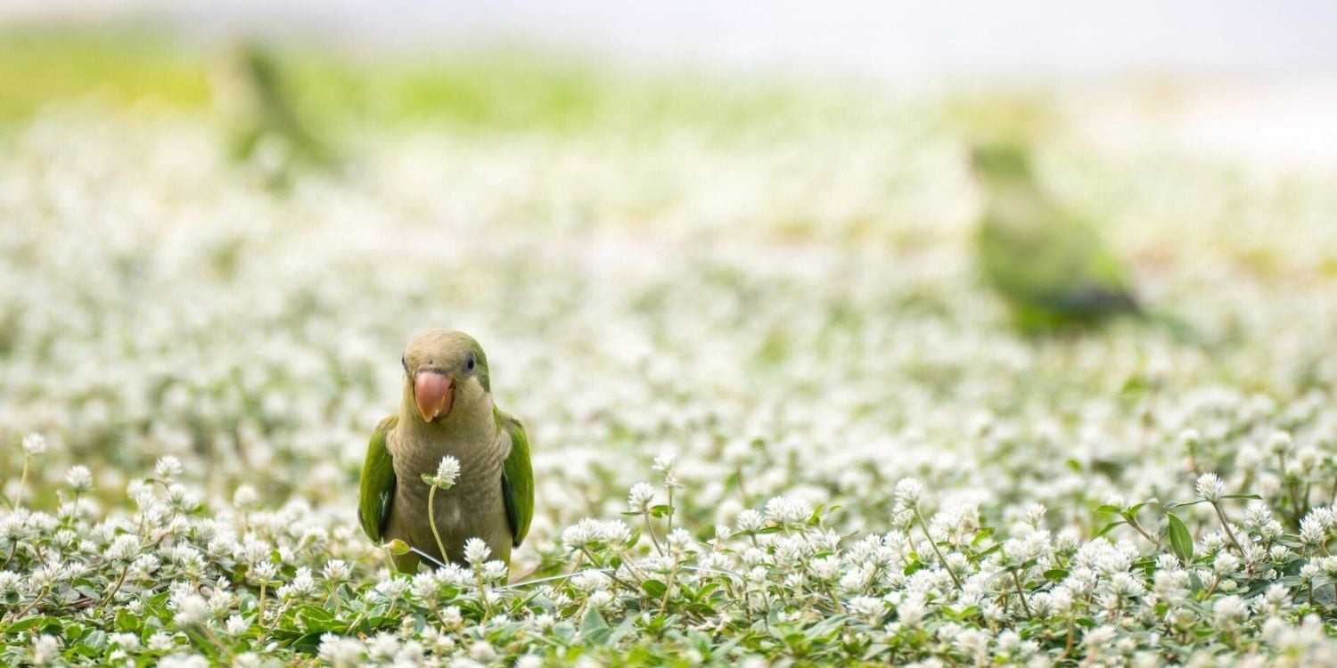 A flock of bright green monk parakeets, a species not native to Singapore, was seen hopping and foraging through a white flower field in East Singapore.