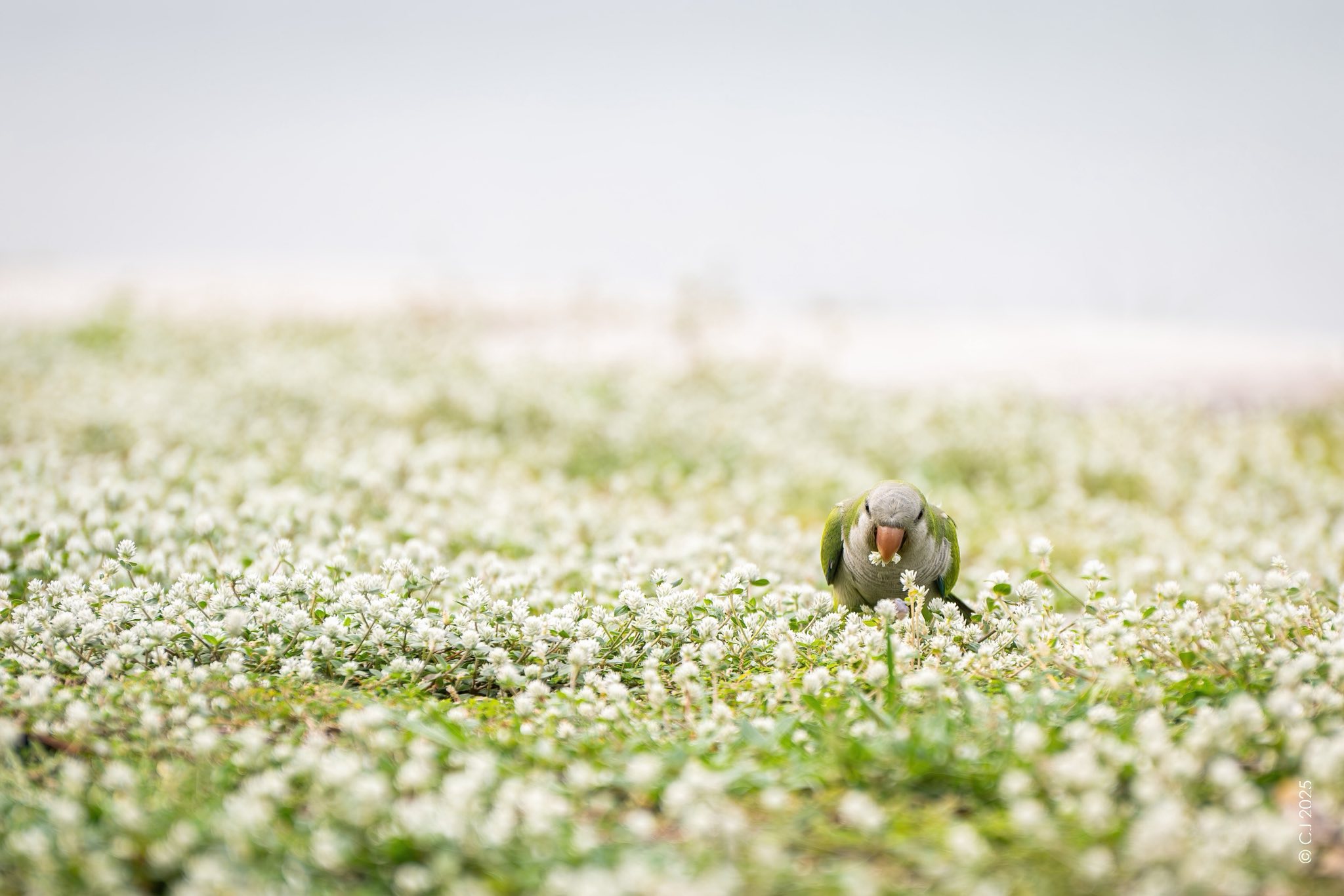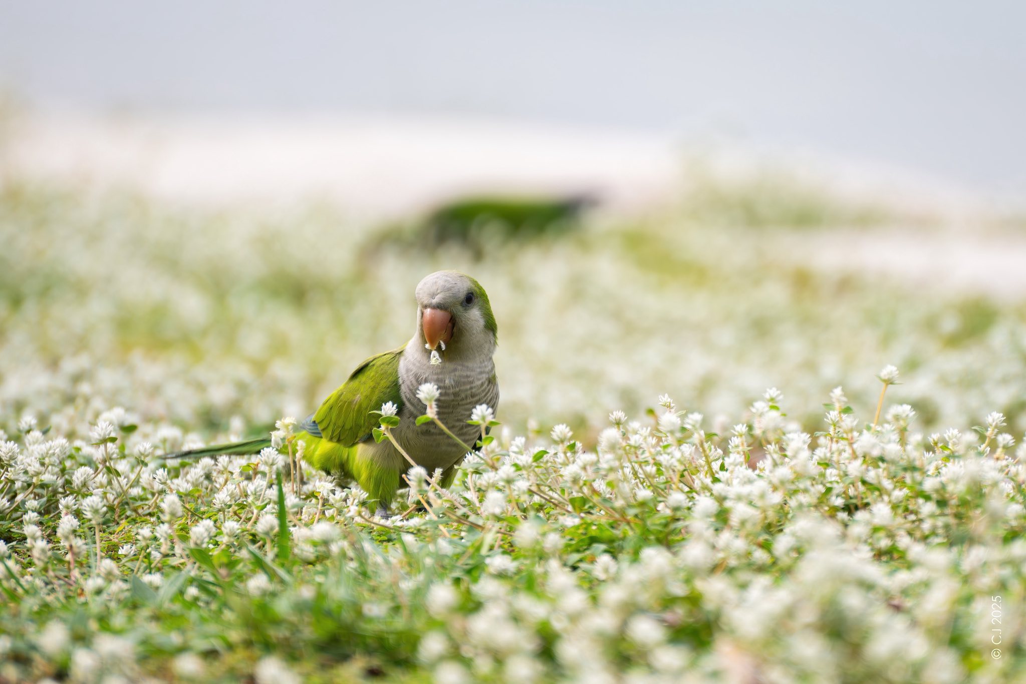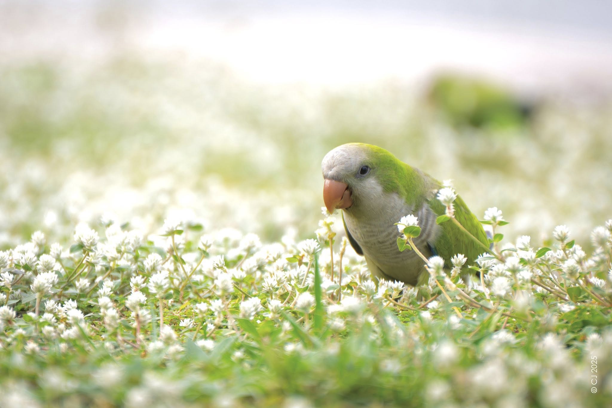 The parakeets hopped through the grass, occasionally munching on petals, CJ said.